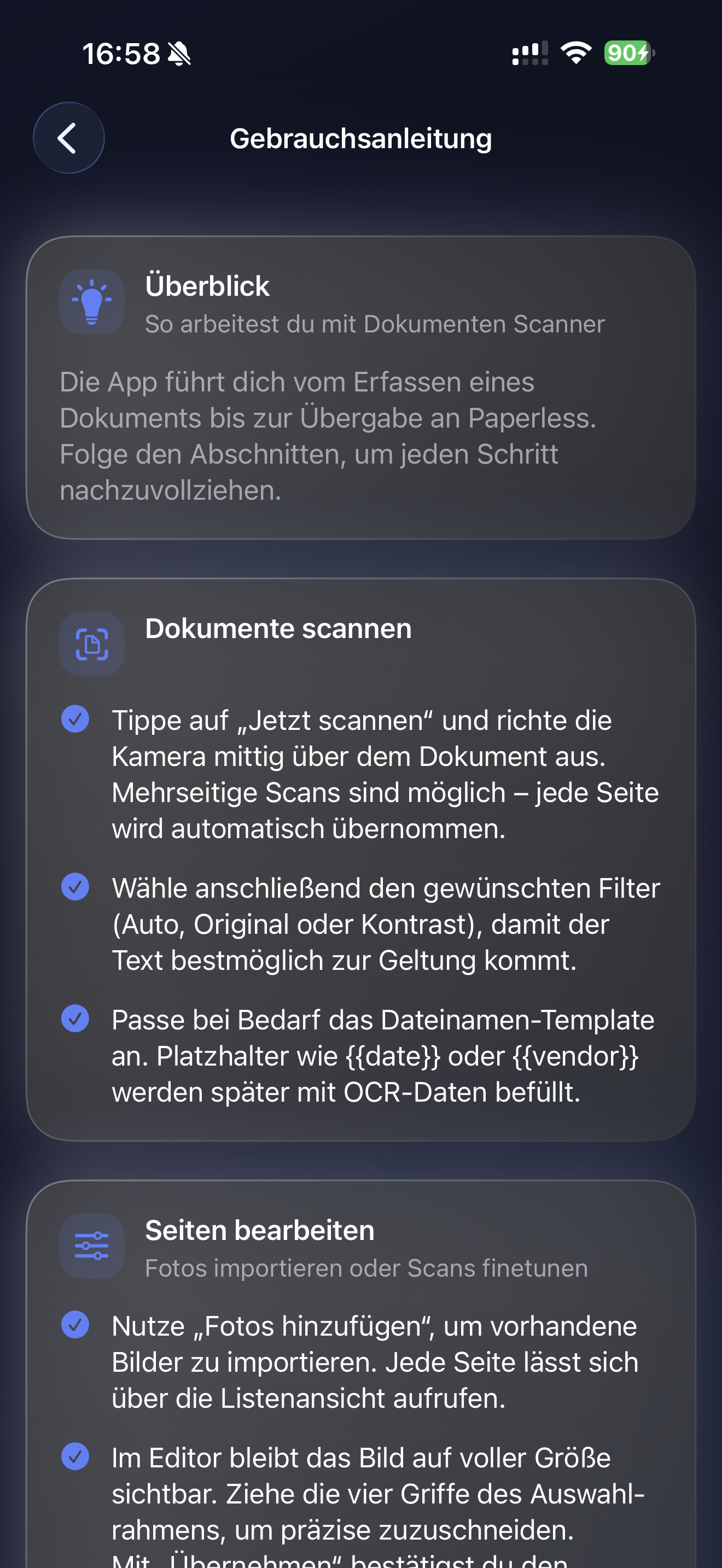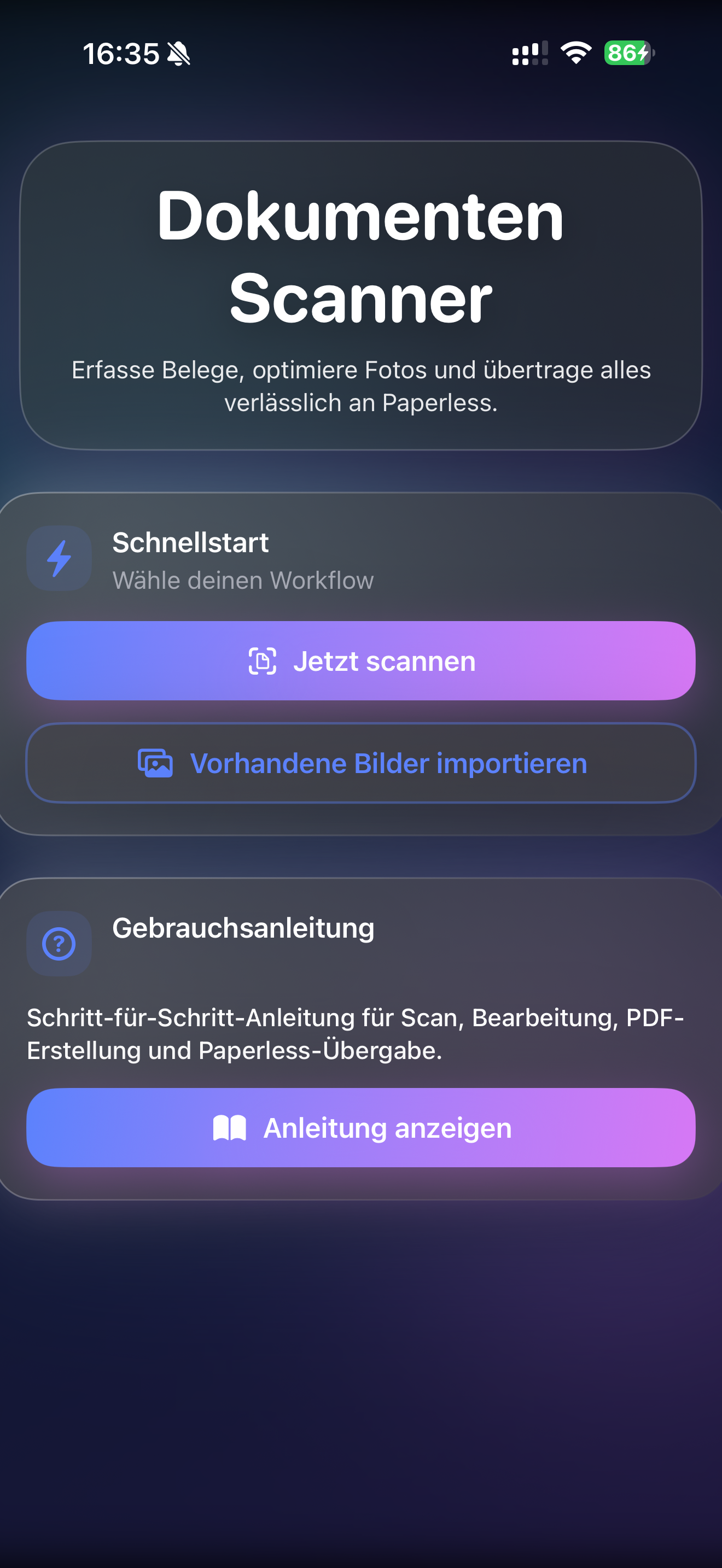 Die integrierte Anleitung führt dich verständlich durch jeden Schritt – vom ersten Scan bis zur fertigen PDF.
