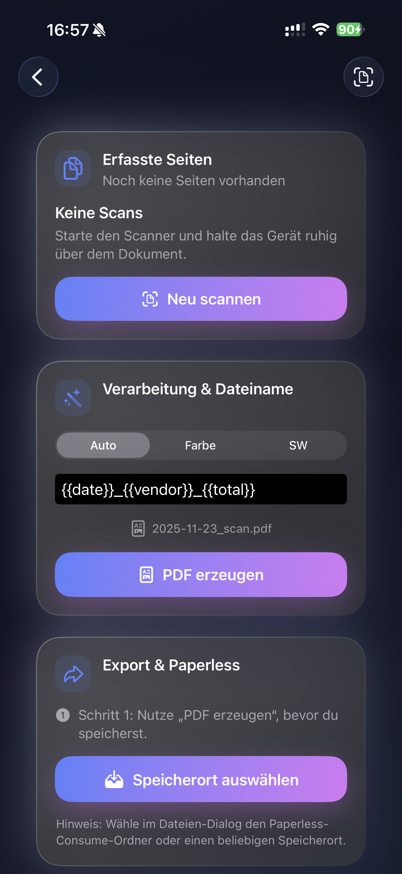 Mit Platzhaltern wie {{date}}, {{vendor}}, {{total}} erzeugt die App automatisch strukturierte und aussagekräftige Dateinamen, basierend auf erkannter Textinformation.